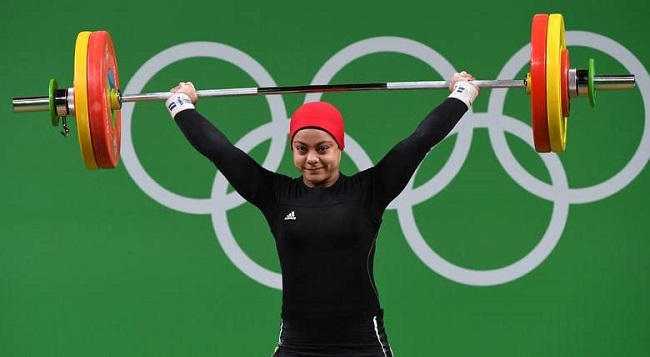 Competing in a hijab headscarf and full-body unitard — attire that fits Muslim tradition but had been prohibited by the International Weightlifting Federation until the rules were changed in 2011 to be more inclusive — Ahmed lifted a combined weight of 255 kilograms (562.1 pounds) to finish just four kilos behind silver medalist Zhazira Zhapparkul of Kazakhstan. Xiang Yanmei of China won the gold medal.